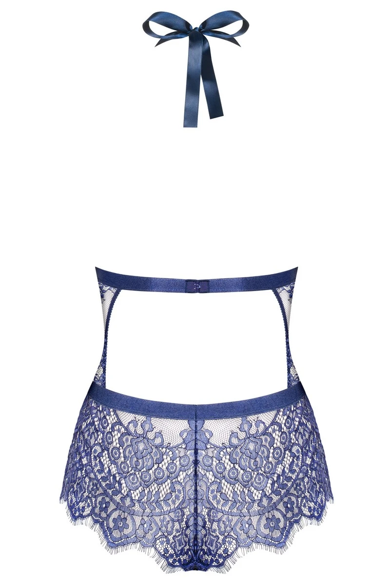 Les bretelles sont résumées à des bandes de satin à nouer derrière la nuque. Une coupe en forme de culotte échancrée ornée de dentelle au-dessus des hanches parfait et rend le body unique.