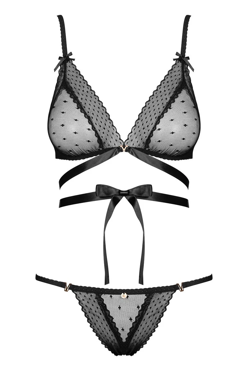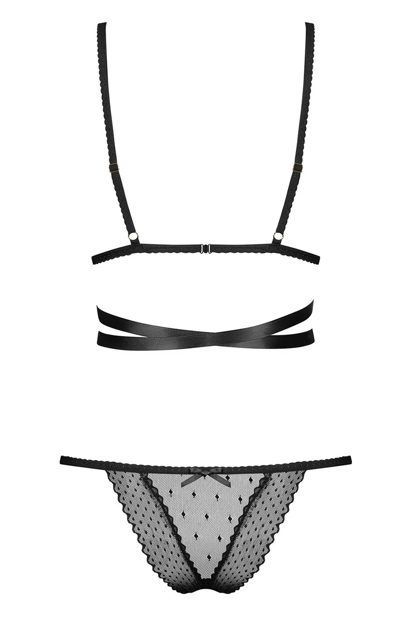 Accentué par des laçages divins, l’ensemble Bowessa séduit par sa coupe osée. Son jeu de laçages rend la lingerie plus sexy et féminine tandis qu’on osera toucher ce petit noeud au centre du corps. De quoi donner un ton plus pimenté. La poitrine est sublimée par un décolleté sexy et sera maintenue par la forte élasticité d’un tissu transparent orné de larges pois.
