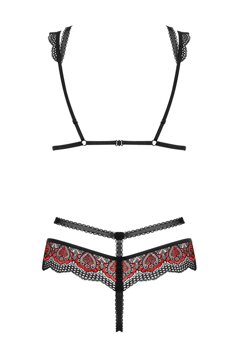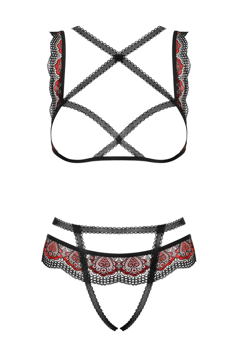 L’ensemble ouvert Megies, c’est de l’audace et de la provocation bien dosée. Avec ses deux pièces de folie, vous aurez tout le plaisir de profiter pleinement de ce que la nature vous a offert. Avec quelques touches de dentelle bordeaux, le charme et la féminité sont soulignés. Le soutien-gorge ouvert met la poitrine à nu sans diverger ; les bretelles travaillées habillent les épaules tandis qu’un jeu croisé passe sur le haut du buste.