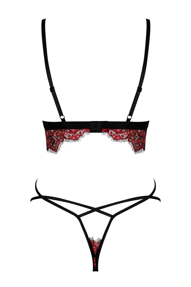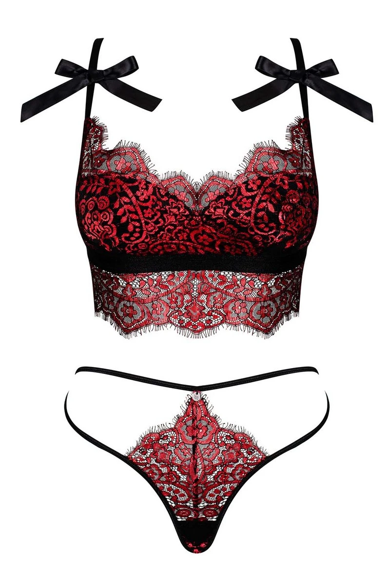 L’ensemble Redessia est composé d’un haut de soutien-gorge en forme de bustier qui dessine une magnifique dentelle bordeaux sur la poitrine, ainsi que de son petit string sexy qui profite d’une délicate parcelle de dentelle et de deux lignes noires qui se posent sur les hanches.