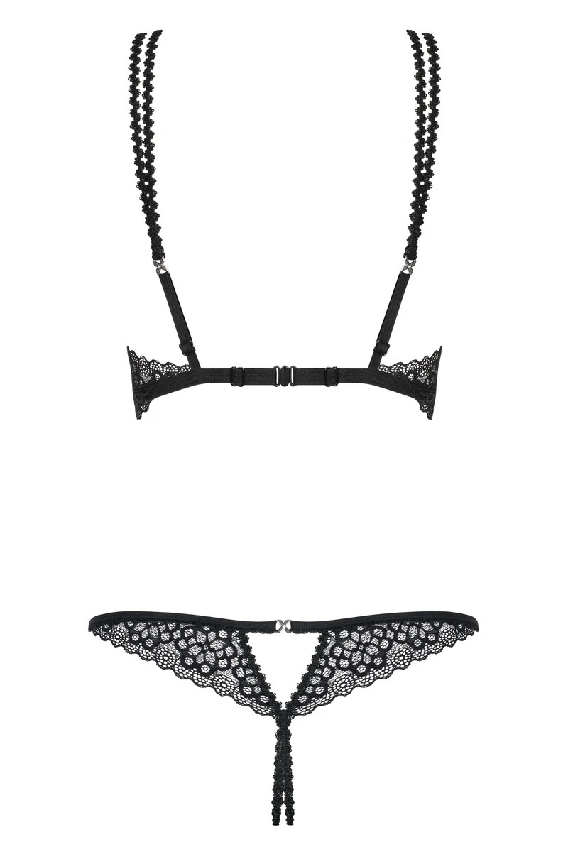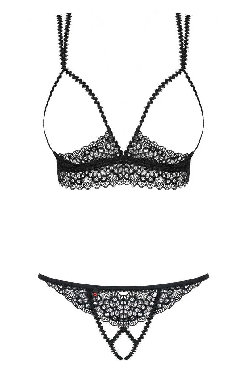 Le string est également coquin et crée une ouverture à l’entrejambe. La dentelle est reprise pour un assortiment réussi. Matière extensible.