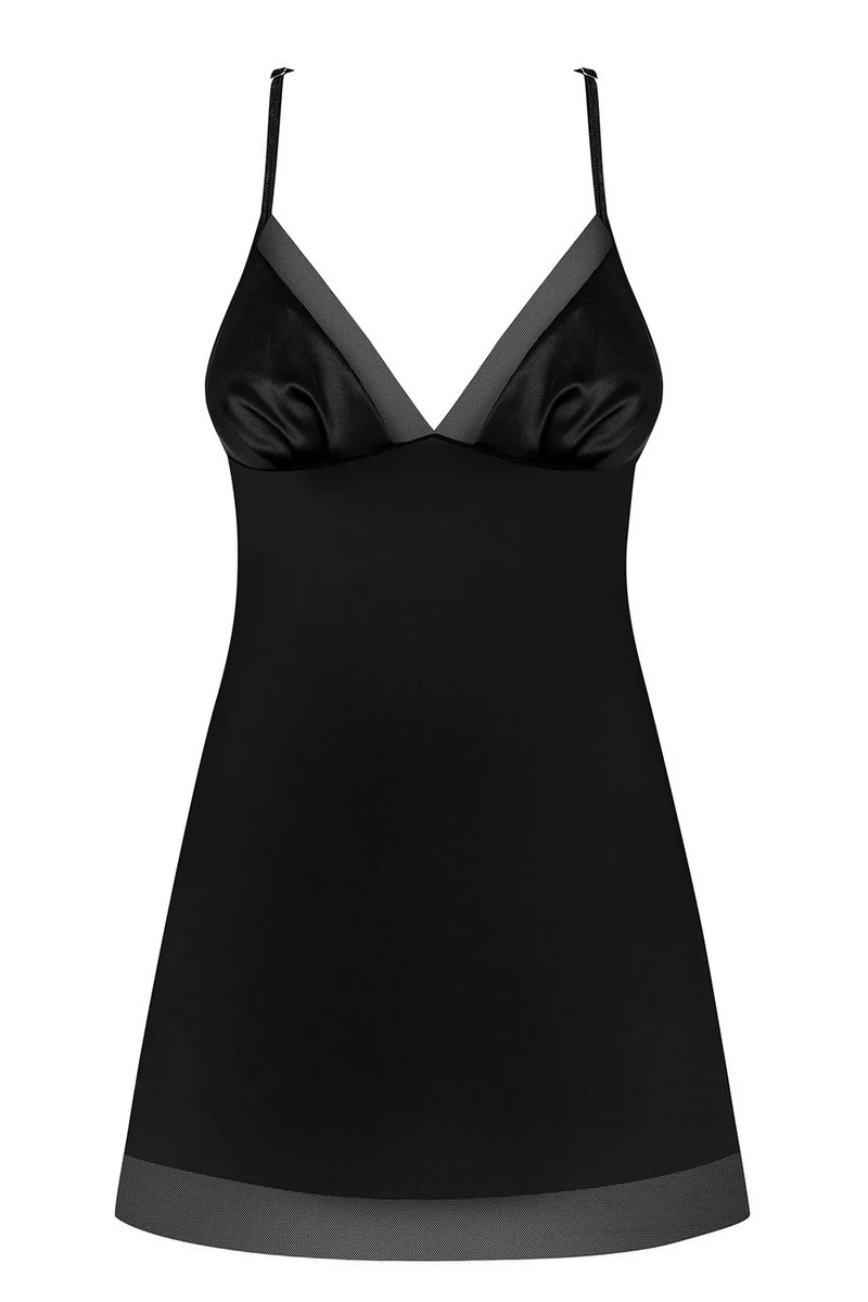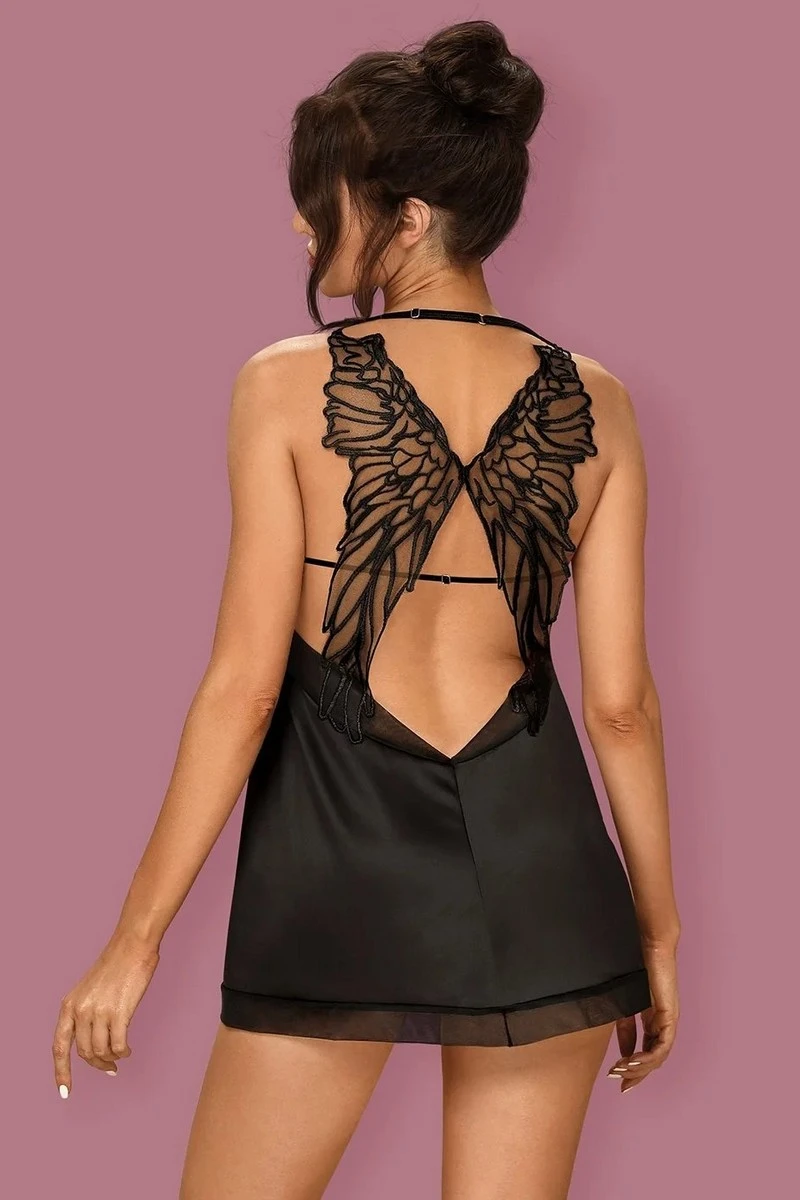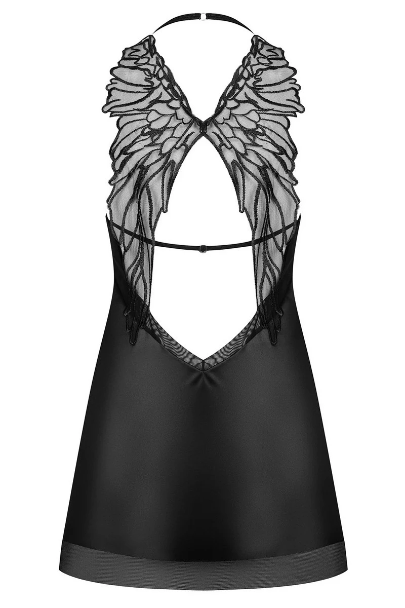 C’est au dos que cette nuisette sexy joue son meilleur atout ; avec une partie dévoilée du dos, elle recouvre les épaules de petites ailes d’ange qui sauront capter le regard. Bretelles réglables et string inclus.