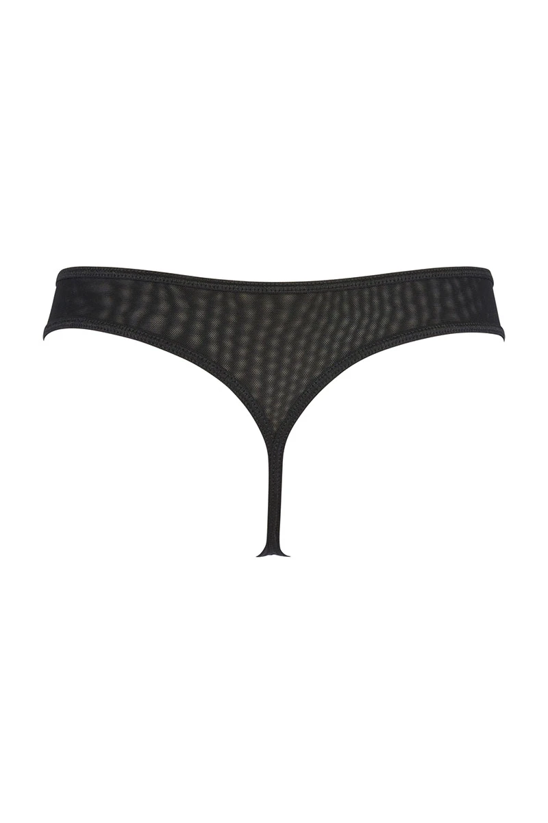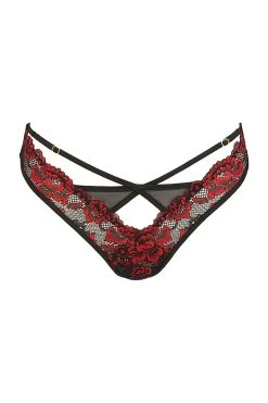 L’avant est fait de rĂ©sille semi-transparente qui se croise afin de reprendre le style du soutien-gorge de sa collection ; on retrouve Ă©galement une coupe Ă©chancrĂ©e qui rend la lingerie plus sexy encore.