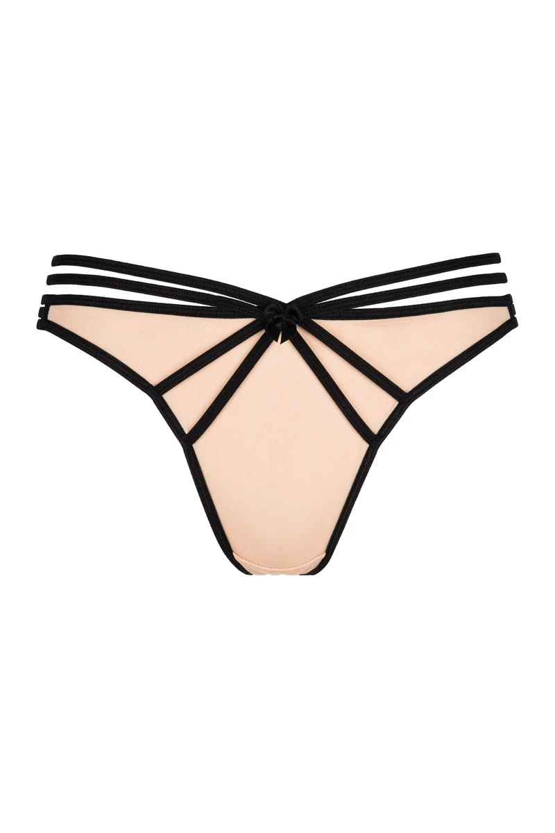 Le string Zephyr V-7008 dispose d’un jeu de contraste avec ses lignes noires sur un fond beige clair. Une couleur peau qui permet de se faire plaisir en portant une lingerie discrĂšte et sexy Ă la fois. On remarquera toujours les laniĂšres qui surmontent la taille tandis que le bas du dos se retrouve dĂ©corĂ© par ce noir intense. Les fesses sont complĂštement dĂ©couvertes et mises en valeur. Le string V-7008 accompagne le soutien-gorge Zephyr V-7001 de la mĂȘme collection.
